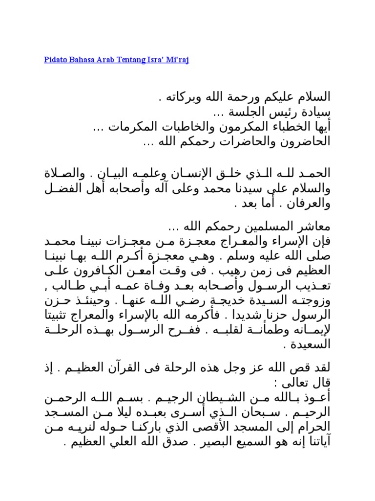At that time the disbelievers tortured the messenger with the smartest tortures interfered with his missionary endeavor by employing various manners shattered his followers and disciples. Home bahasa arab contoh teks pidato bahasa arab kls i tinggalkan komentar. Contoh Pidato Isra Miraj Baik kali ini admin akan membahas tentang berbagai macam teks Pidato isra miraj biasanya berisi materi tentang suatu pandangan khusus tentang kehidupan manusia dan hubungannya dengan acara isra miraj yang diadakan setiap tahunnya.