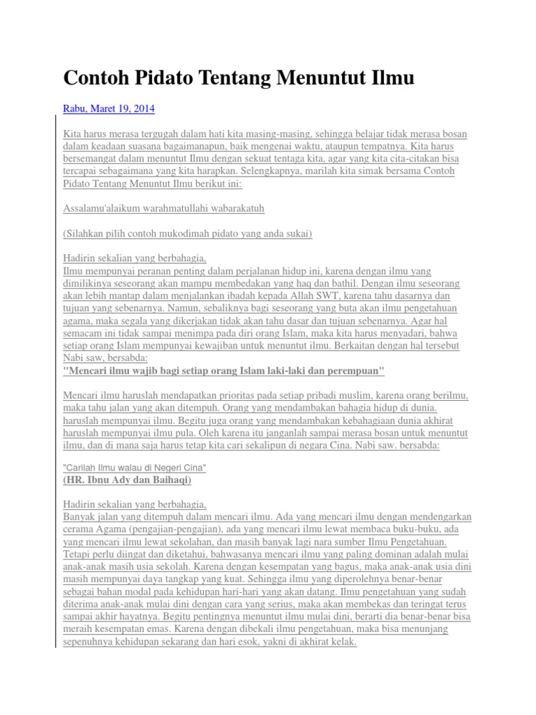 Contoh Pidato Lingkungan. Peace be upon you and Allah mercy and blessings. Oke inilah contoh teks pidato bahasa arab dan artinya dengan tema pentingnya menuntut ilmu atau pentingnya ilmu.