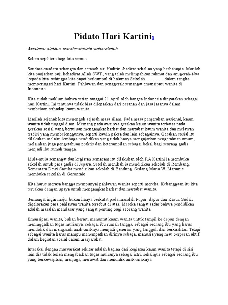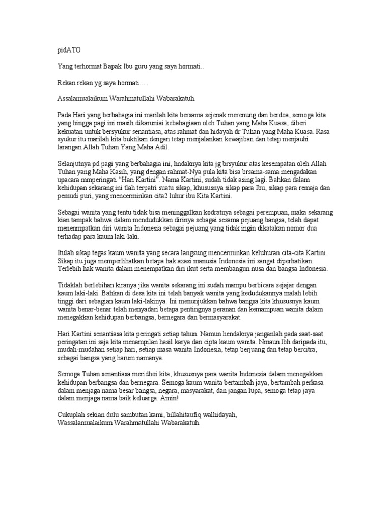 Contoh pidato yaitu seperti pidato kenegaraan pidato menyambut hari besar pidato pembangkit semangat pidato sambutan acara atau event dan lain sebagainya. Atur Pambagyo Wilujeng Ing Temantenan. Kartini telah berhasil menggelorakan gagasan kemanusiaan wanita dan menggugat hak azazi kemanusiaan hak-hak persamaan dan kemerdekaan untuk hidup bermasyarakat dan menikmati kebahagiaan hidup dan kehidupan selaku Anugreah Allah kepada segenap manusia.
