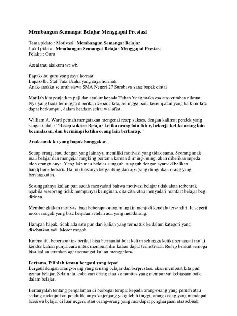 Yang saya hormati Bapak Dedi selaku guru Bahasa Indonesia dan teman-teman yang saya sayangi. Usulkan judul contoh pidato apa saja yang mungkin dibutuhkan. Contoh Pidato tentang Motivasi Belajar Unknown 2016-09-26T081700-0700 50 stars based on 35 reviews CONTOH PIDATO Tentang MOTIVASI BELAJAR Assalamualaikum warahmatullahi wabarakatuh.
