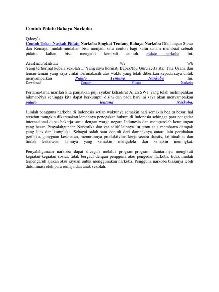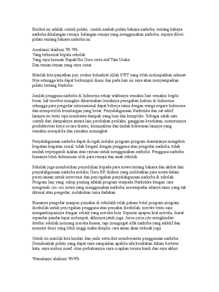 Demikian sedikit pidato tentang bahaya narkoba untuk remaja Indonesia yang dapat saya sampaikan. Pidato bahasa Indonesia merupakan suatu bentuk kreatifitas untuk. Bagi BapakIbu guru yang berminat semua bentuk perangkat pembelajaran silahkan menghubungi admin via WA.