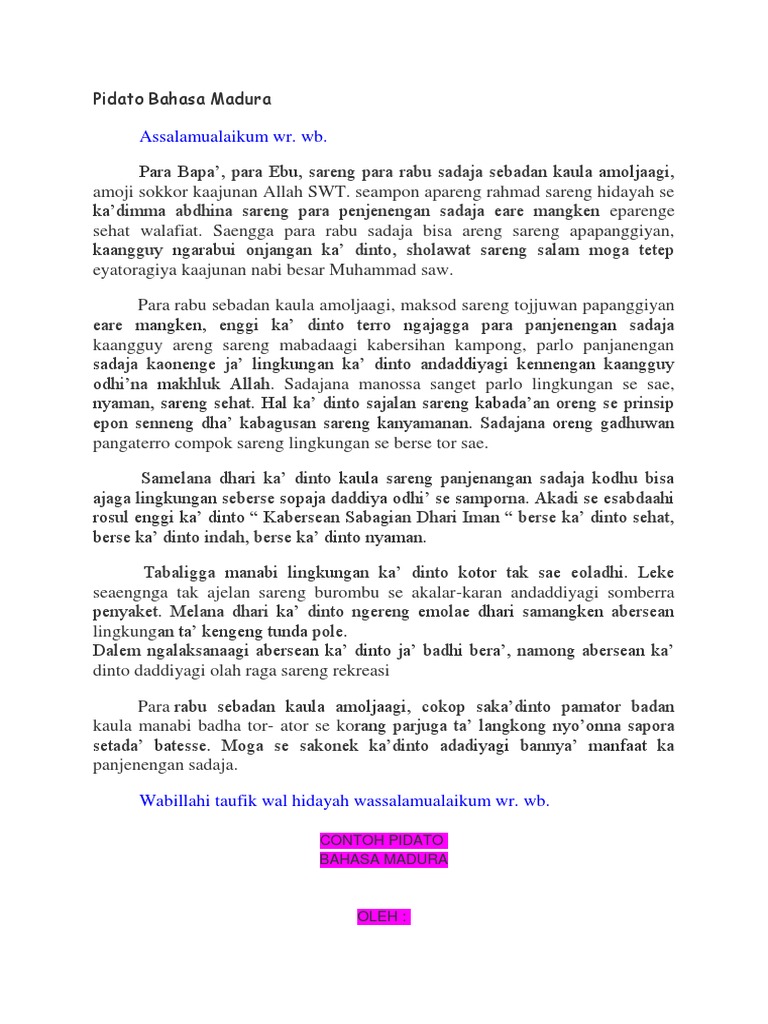 Contoh pidato bahasa madura yang lucu. Contoh Pidato Sholat Jumat. Contoh 1 contoh pidato bahasa jawa dalam sambutan penerimaan pengantin laki laki assalamu alaikum warahmatullahi wabarakatuh. Kumpulan contoh pantun madura tentang nasehat cinta dan kehidupan dan juga pantun madura lucu yang terkenal akan sarat maknanya yang begitu dalam.