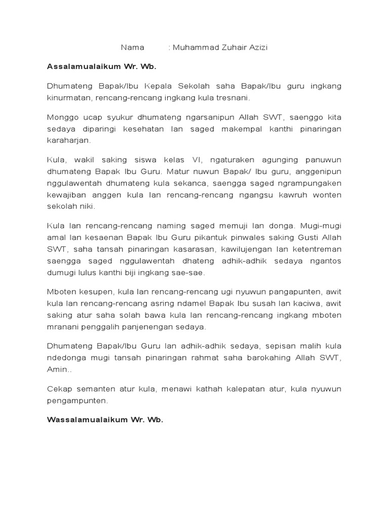 Contoh pidato bahasa jawa tentang perpisahan kelas 6. Sesuah menyimpulkan maka anda pun perlu menutup pidato yang disampaikan dengan salam penutup. Kini pidato berbahasa Jawa semakin digencarkan agar bisa melestarikannya. Contoh pidato perpisahan kelas 6 bahasa jawa.