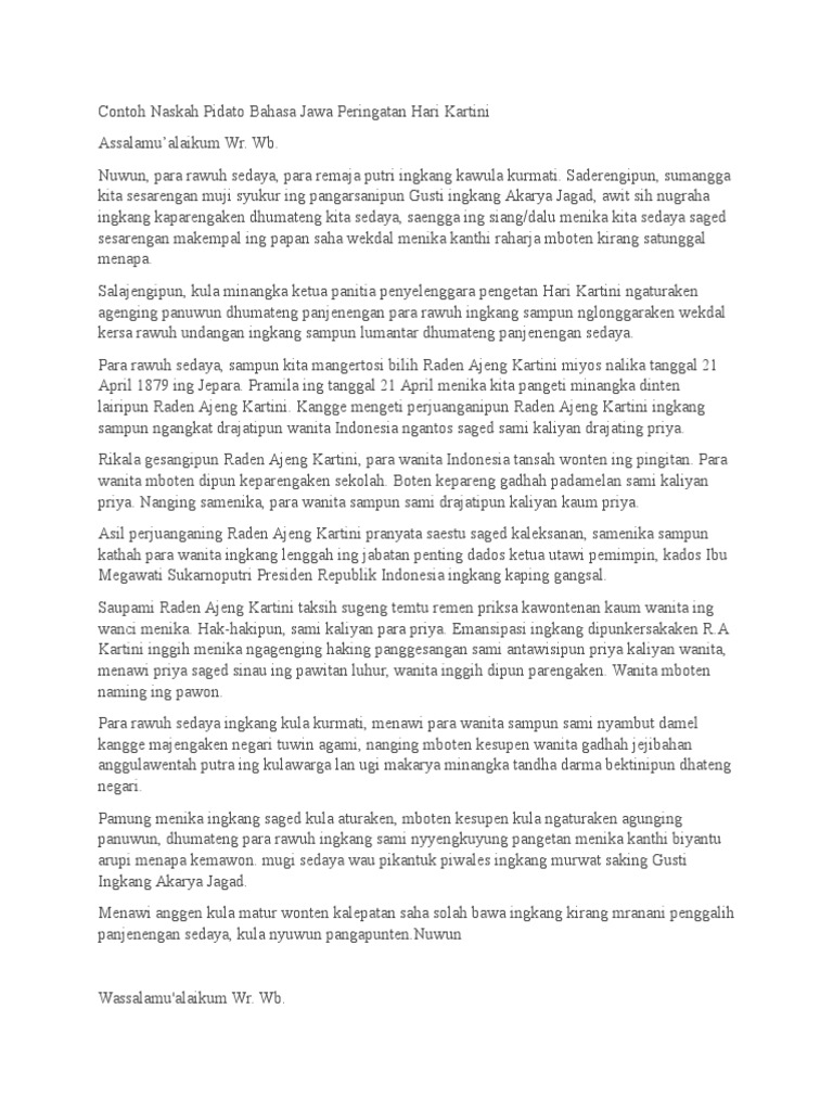 Pidato Bahasa Jawa. Home contoh Contoh Pidato Bahasa Jawa Tentang Peringatan Hari Kartini. Kartini telah berhasil menggelorakan gagasan kemanusiaan wanita dan menggugat hak azazi kemanusiaan hak-hak persamaan dan kemerdekaan untuk hidup bermasyarakat dan menikmati kebahagiaan hidup dan kehidupan selaku Anugreah Allah kepada segenap manusia.