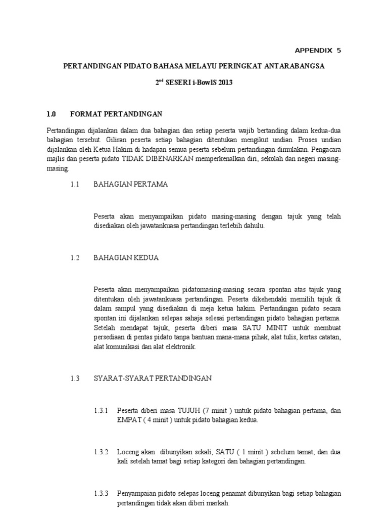 Kumpulan Contoh Pidato Teks Pidato Bahasa Melayu Merentas Dunia Pidato Pendidikan Teks Pidato Bahasa Melayu Merentas Dunia Pidato Bahasa Inggris Contoh pidato pendidikan Pidato bahasa inggris bahasa indonesia pidato sekolah pidato perpisahan pidato formal pidato singkat hal penting. Laporan 3 Contoh soalan 4 Skema jawapan 4-5 Contoh esei 6-7 Format 2. 24 KEMENTERIAN PELAJARAN MALAYSIA PERTANDINGAN BAHAS BAHASA MELAYU ALA PARLIMEN SEKOLAH MENENGAH KERTAS KONSEP SISTEM PEMARKAHAN BAHAS BAHASA MELAYU ALA PARLIMEN SEKOLAH MENENGAH KEMENTERIAN PELAJARAN MALAYSIA 10 HUJAHAN JUMLAH 110 MARKAH MASA 8 MINIT 11 Setiap pembahas akan diberi markah mengikut pembahagian berikut.