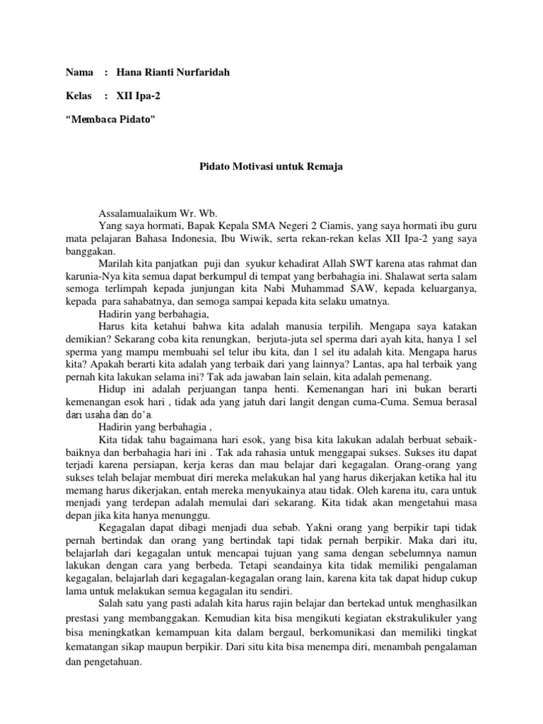 Yang saya hormati Bapak Kepala SMA Negeri 2 Ciamis yang saya hormati ibu guru mata pelajaran Bahasa Indonesia Ibu Wiwik serta rekan-rekan kelas XII Ipa-2 yang saya banggakan. Pidato Bahasa Indonesia Tentang Motivasi. 12 teks pembukaan pidato bahasa jawa.