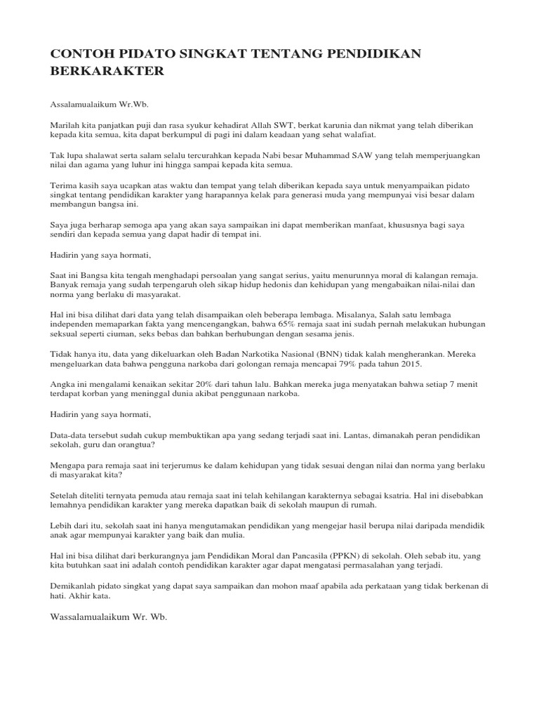 Pendidikan karakter ini juga bisa melahirkan banyak nilai positif terhadap diri kalian yakni sifat dan budi pekerti yang terpuji. Contoh teks pidato singkat tentang pendidikan berkarakter bahasa indonesia Assalamualaikum WrWb. Contoh Pidato Tentang Pendidikan Berkarakter.
