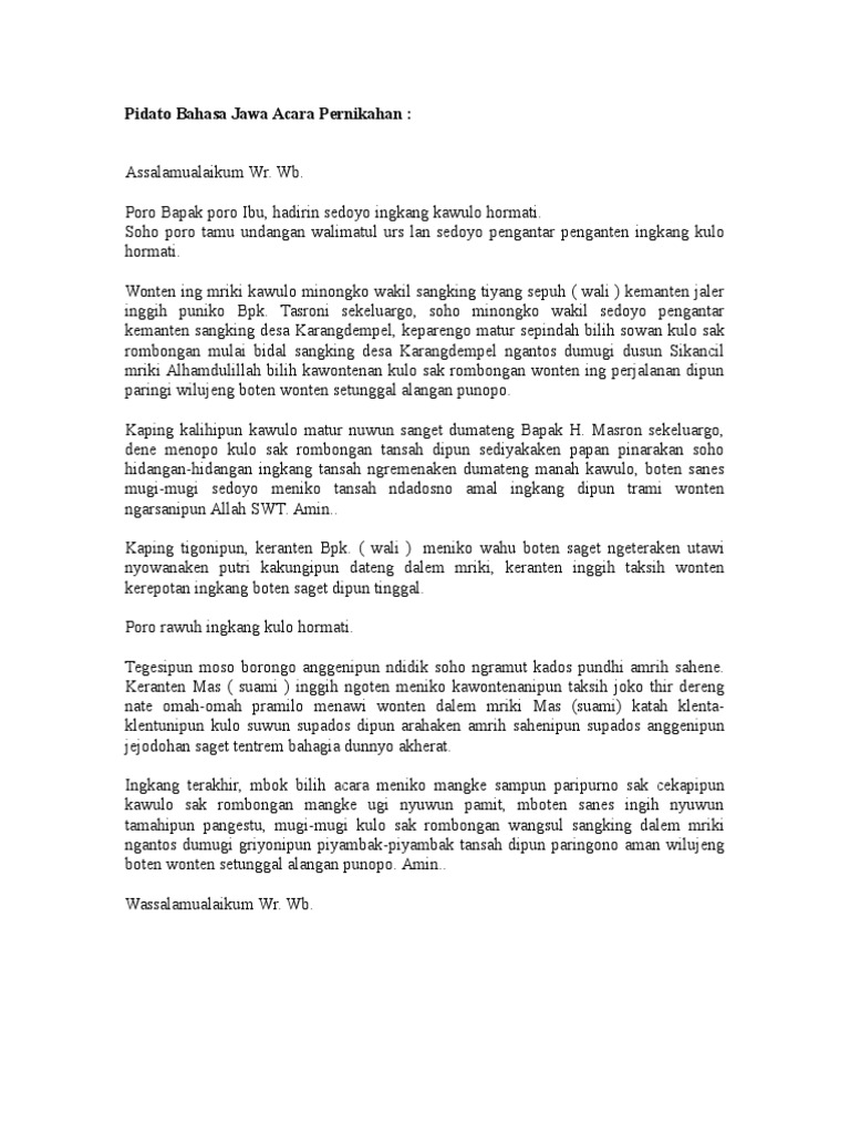 Pidato Basa Jawa. Contoh Pidato Pernikahan Bahasa Jawa. CONTOH 1 Pidato Sambutan Dalam Acara Perkawinan Assalamu alaikum warohmatullahi wabarokatuh Bapak-bapak saudara-saudara sekalian yang kami hormati.