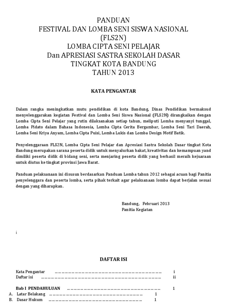Panduan Festival dan Lomba Seni Siswa Nasional FLS2N SD Tingkat Provinsi ini disusun sebagai acuan bagi panitia penyelenggara di tingkat kabupatenkota serta pihak-pihak terkait sehingga pelaksanaan FLS2N-SD Tahun 2016 dapat berjalan sesuai yang diharapkan. Untuk itu disini kami akan mencoba memberikan salah satu contoh teks pidato pembukaan acara lomba. Petunjuk Teknis Pelaksanaan FLS2N 2017 Lomba Pidato Cipta Puisi dan Baca Puisi Oleh M.