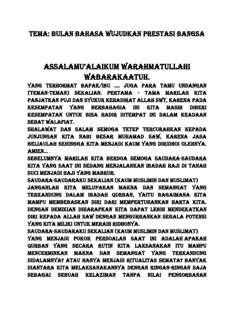 Contoh pidato bahasa indonesia tentang qurban. In Muslim history as described in the Quran there are two events he did sacrifice rituals by Abel Abel and Qabil Cain son of Prophet Adam Alaihis Salam as well as at the time of the Prophet Abraham would sacrifice Prophet Ismail on the orders of Allah SWT. File berformat Microsoft Word Documents DOCRTF silahkan download secara gratis dan kembangkan kembali agar lebih sempurna. Bagi kalian para siswa atau siapa saja yang kebetulan sedang mencari contoh pidato yang bertemakan Kurban.