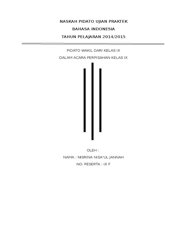 Pidato Bahasa Indonesia. Yang terhormat Bapak kepala Sekolah SMPN 2 Sindang Bapak dan Ibu guru yang saya hormati beserta teman-temanku sekalian pertama-tama marilah kita panjatkan Puji dan Syukur ke hadirat Allah SWT karena berkat karunia-Nya kita dapat berkumpul dalam keadaan sehat walafiat di tempat ini. Kisi-kisi dan soal ujian praktik mata pelajaran bahasa indonesia tahun pelajaran 20132014.