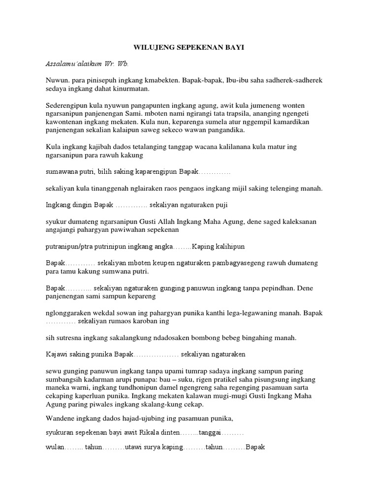 Semoga dapat membantu Anda dalam mempelajari bahasa Inggris lebih lanjut. Dhumateng Bapak Kepala Desa Kaliyan Perangkatipun ingkang kinormatan Para sesepuh pinisepuh ingkang tansah kinabekten Para warga lan tamu undangan ingkang mboten saged kawula sebataken setunggal-setunggal ingkang kawula hormati. Puji saha syukur kita panjataken dumateng allah subhanahu wa taala ingkang sampun aweh rahmat lan hidayahipun kangge kita sedaya sahinggo kita sedaya saged.