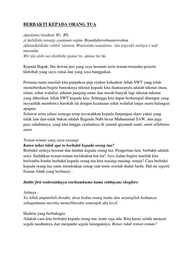 1 Contoh-Contoh Pidato Berbakti Kepada Orang Tua Untuk Berbagai Tempat. File berformat Microsoft Word Documents DOCRTF silahkan download secara gratis dan kembangkan kembali agar lebih sempurna. Contoh PidatoCerama Islami-BERBAKTI KEPADA KEDUA ORANG TUA BIIRUL WALIDAIN February 7 2013.