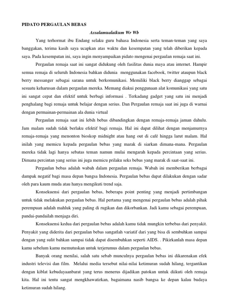 Pidato Pergaulan Bebas Assalamualaikum Wr Wb Yang Terhormat Ibu Endang Selaku Guru Bahasa Indonesia Serta Teman Teman Yang