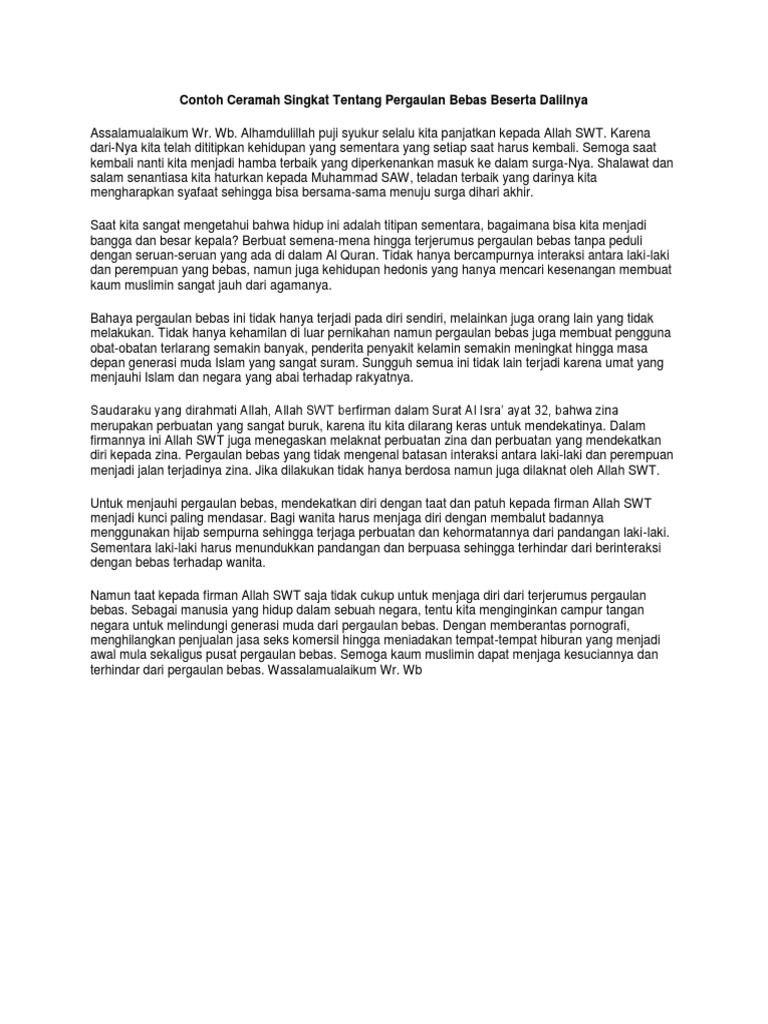 Ceramah islam tentang pergaulan bebas Contoh Pidato Bahasa Indonesia. Wabah sporadis yang tidak terkendali ini memberikan berbagai dampak negatif bagi masa depan bangsa Indonesia. Pada kesempatan ini saya hendak menyampaikan pidato mengenai kebebasan dalam pergaulan bebas.