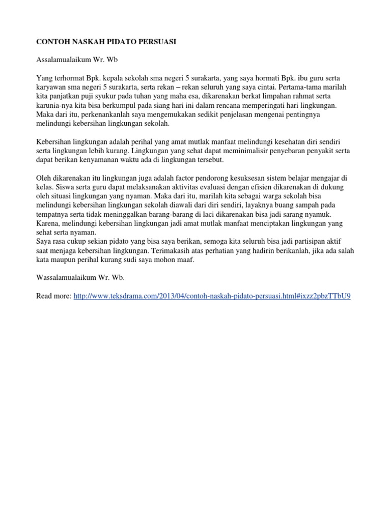 Yang saya hormati Bapak Ibu guru dan karyawan Sekolah SDIT Salsabila Kepanjen. Seperti kebanyakan pidato komposisi dalam pidato yang bersifat persuasif tetap sama. Pidato Kebersihan Lingkungan.