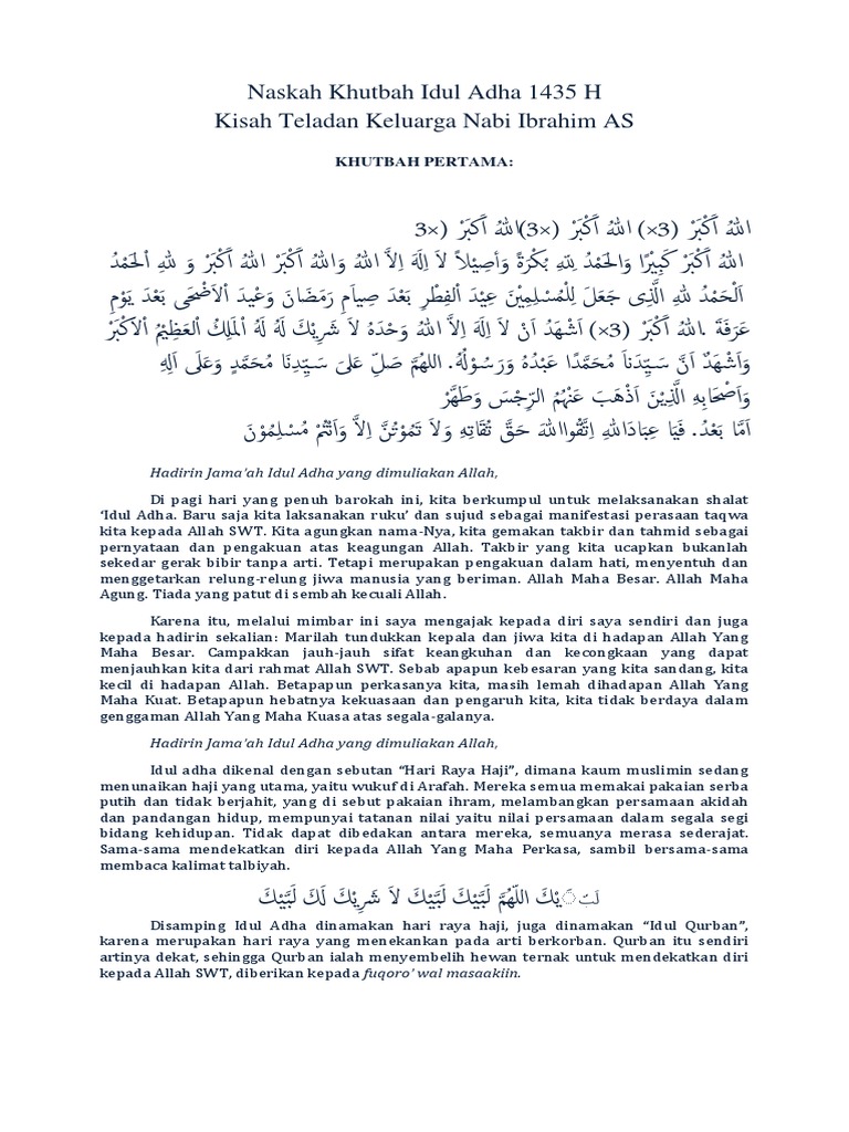 Keluargaku yang dirahmati Allah Kita berharap dengan melaksanakan shalat Idul Adha di rumah ini kita akan dicatat sebagai hamba-hamba Allah yang sabar. Hadirin Jamaah Idul Adha yang dimuliakan Allah Di pagi hari yang penuh berkah ini kita berkumpul untuk melaksanakan shalat Idul Adha. Bukan Tuhan selain Allah.