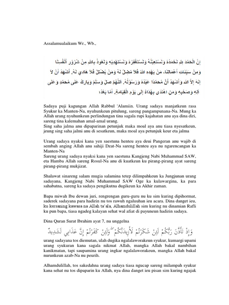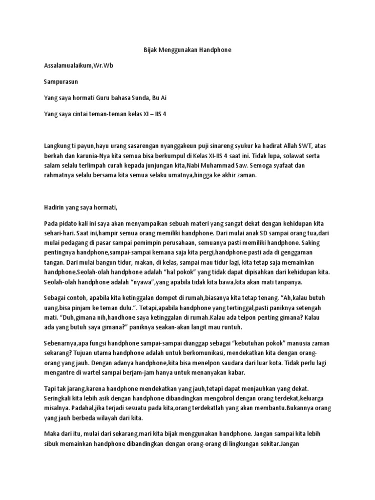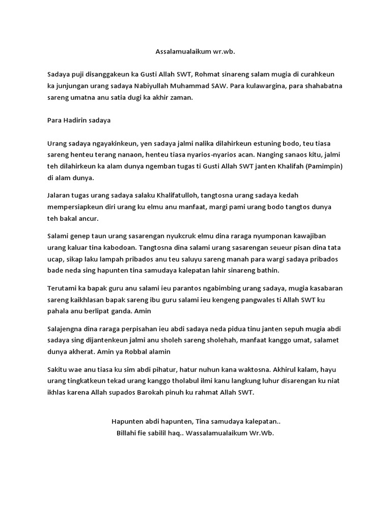Kumargi kitu simkuring papadon urangmah kudu taat ka ajaran Allahaneh dijauhkan Tina Sagala marabahaya Jeung dijauhkan Tina dosa anu gede atanapi anu leutik Oge. Manehna ngagunakeun mediangagunakeun teknologi geus teu aleucreug. Naskah Biantara Pidato Bahasa Sunda Tujuan dari pidato dalam bahasa sunda sendiri pada dasarnya sama saja seperti dengan pidato bahasa-bahasa lain pada umumnya.