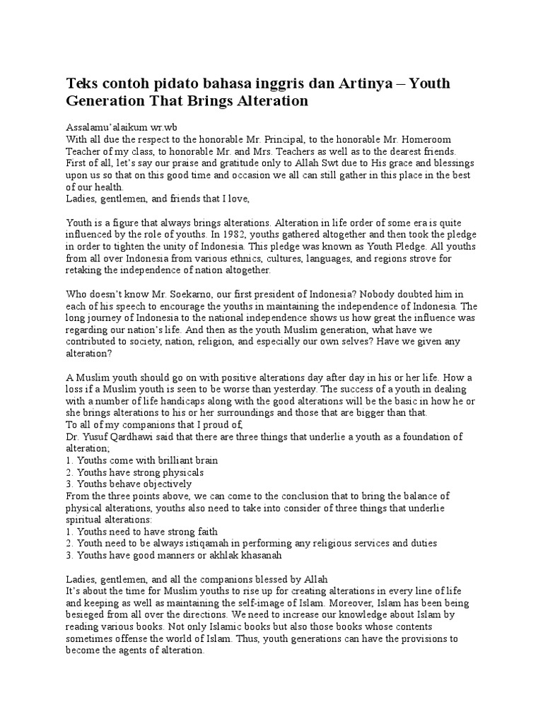Pidato di bawah bisa digunakan oleh pelajar sekolah SD SMP SMA atau bahkan mahasiswa. Allohuma sholi ala Muhammad waala ali syaidina Muhammad amma badu. First of all lets say all the praise and gratitude to Allah Swt due to all of His blessing mercy and guidance upon all of us.