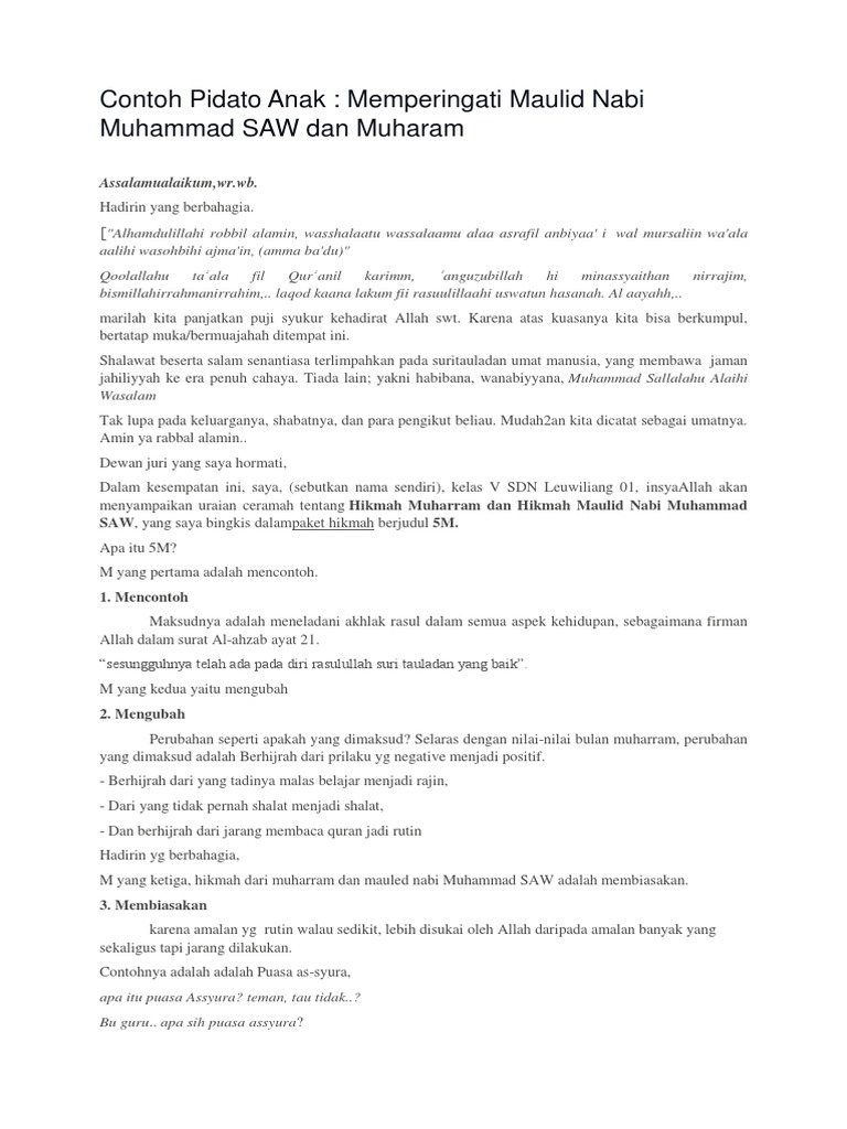 Maulid nabi muhammad saw merupakan peringatan hari besar islam lahirnya rasulullah yang jatuh pada tanggal 12 rabiul awal tahun gajah. Berikut adalah Contoh Pidato Untuk Anak SD. Contoh Pidato Anak.