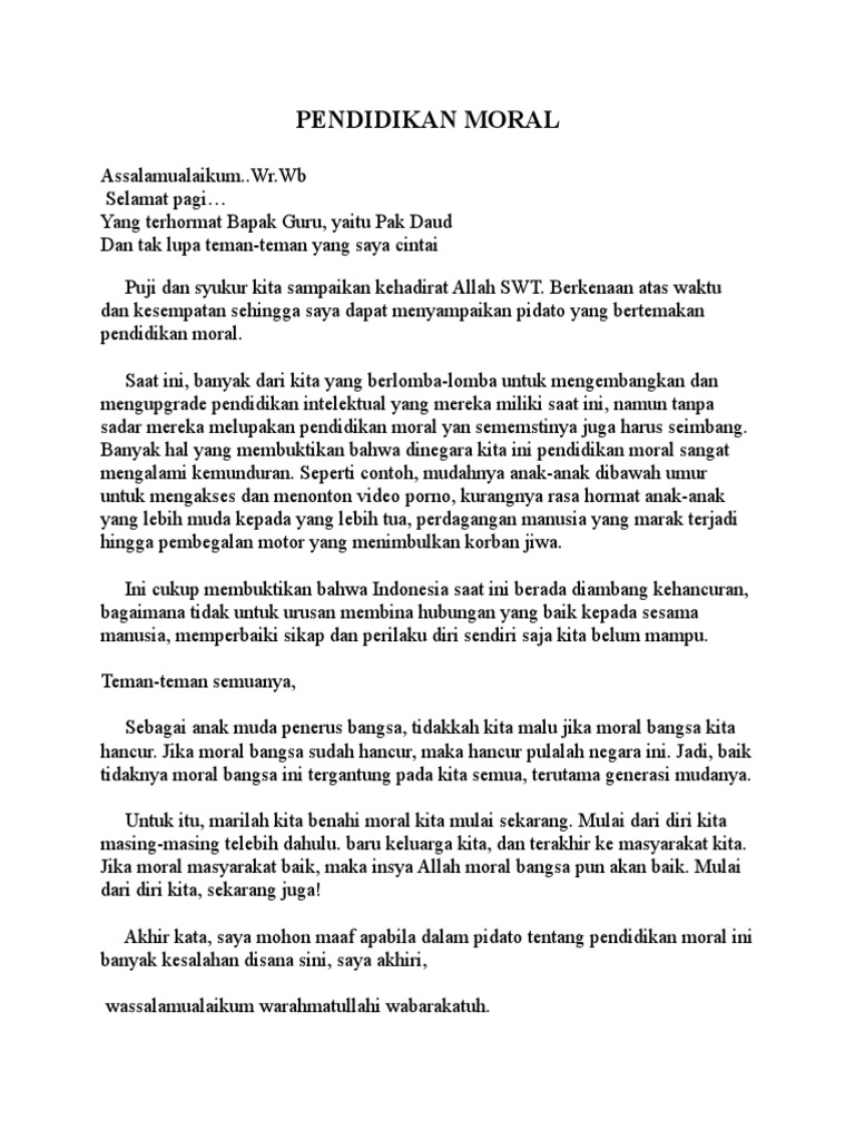 Assalamualaikum wr wb Bapak ibu guru beserta teman-teman yang saya hormati pertama-tama marilah kita panjatkan puji dan syukur Kehadirat Allah Yang Maha Esa yang telah memberikan rahmat dan hidayahnya kepada kita semua sehingga kita dapat berkumpul ditempat ini saya ucapkan banyak terimakasih atas. Semakin baik moral masyarakat maka bangsa ini menjadi semakin kokoh dan kuat. Contoh Teks Pidato Tentang Pendidikan Moral Assalamualaikum Warahmatullahi Wabarakatuh Segala puji bagi Allah SWT yang telah melimpahkan kepada kita semuanya rahmat dan hidayahNya tidak lupa juga shalawat dan salam semoga tetap terlimpah curahkan kepada nabi besar kita nabi Muhammad SAW yang semoga kita semuanya tetap istiqamah dijalan yang dimuliakannya.