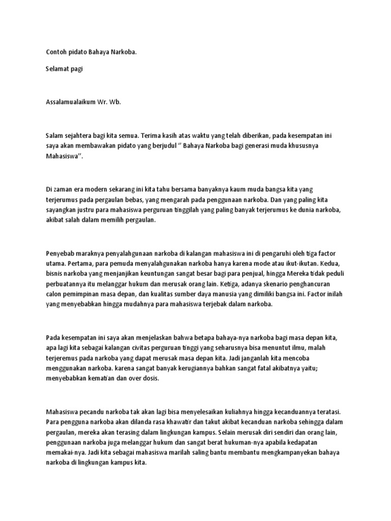 Teks eksposisi pidato bahaya narkoba bagi generasi muda. Assalamu alaikum wr wb Salam sejahtera bagi kita semua Bapak Kepala Sekolah yang saya hormati Bapak dan Ibu Guru yang saya taati serta teman-tema yang saya kasihi. Pastikan orang-orang yang kita ajak bicara mengerti dan familier dengan isu yang kita bicarakan. Ya pidato merupakan suatu ucapan dengan susunan yang baik dan.