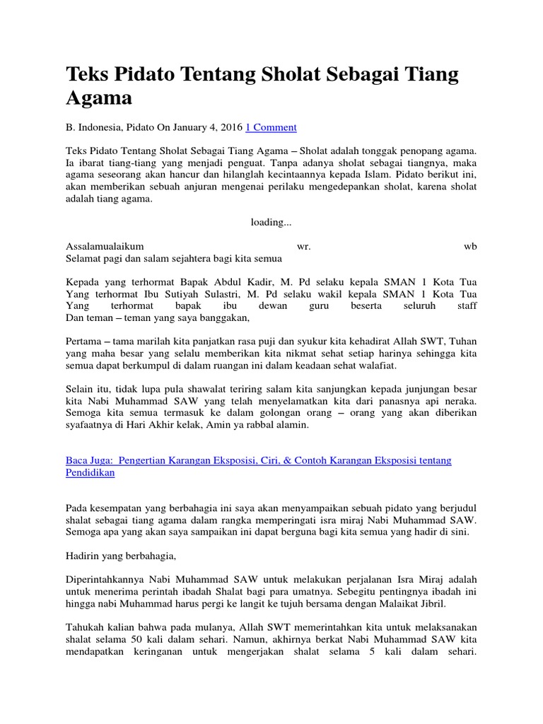 Contoh Pidato Anak tentang Sholat itu Tiang Agama. Beliau adalah sosok yang tak tergantikan didunia ini. Contoh teks pidato singkat yang akan mimin bahas seperti pidato tentang pendidikan bahasa indonesia agama islam tentang al quran pidato pembangkit semangat pidato sambutan acara atau event dan lain sebagainya.