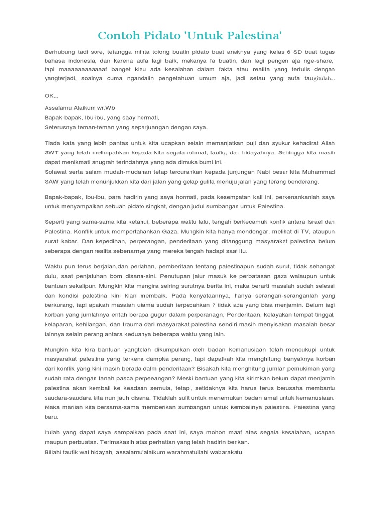 Teks pidato bahasa inggris tentang palestina. Pidato di bawah bisa digunakan oleh pelajar sekolah SD SMP SMA atau bahkan mahasiswa. Pidato Bahasa Inggris. Terima kasih telah mengunjungi blog Berbagai Teks Penting 2019.