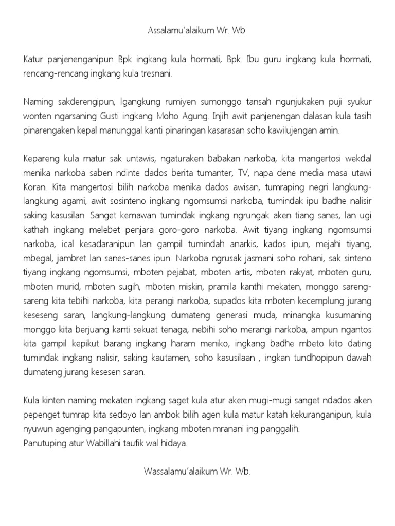 Contoh Pidato Bahasa Jawa Tentang Acara Halal Bil Halal. DOC ETIKA BERBAHASA JAWA PADA REMAJA DALAM PERGAULAN. Dalam sejarah sebagaimana disebuat di contoh pidato bahasa inggris dan artinya dibawah ini telah dibuktikan dengan sumpah pemuda yang telah mempersatukan pemuda di seluruh Indonesia tanpa membedakan suku.