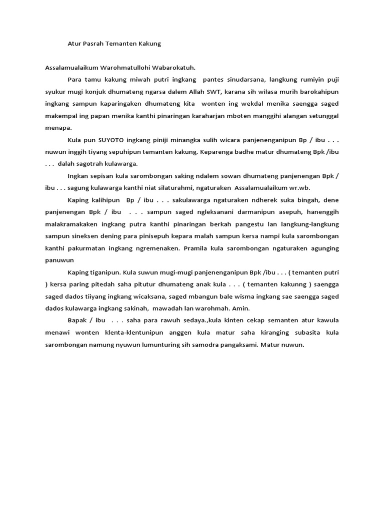 Teks pidato bahasa jawa pasrah penganten kakung. Kula pasrahaken penganten putra punika ingkang dereng gadhah pengalaman anggenipun nggayuh perkawis omah-omah. Contoh Atur Pasrah Penganten Kakung Panjenenganipun ingkang dhahat kinabekten para pepundhen para pinisepuh saha para sesepuh ingkang tansah anggung mestuti dhumateng darmaning kautamen. 10 Maret 2018 sendang-wonogiri Artikel Warga Kabar Desa Lingkungan Seni dan Kebudayaan Tokoh Masyarakat 6.