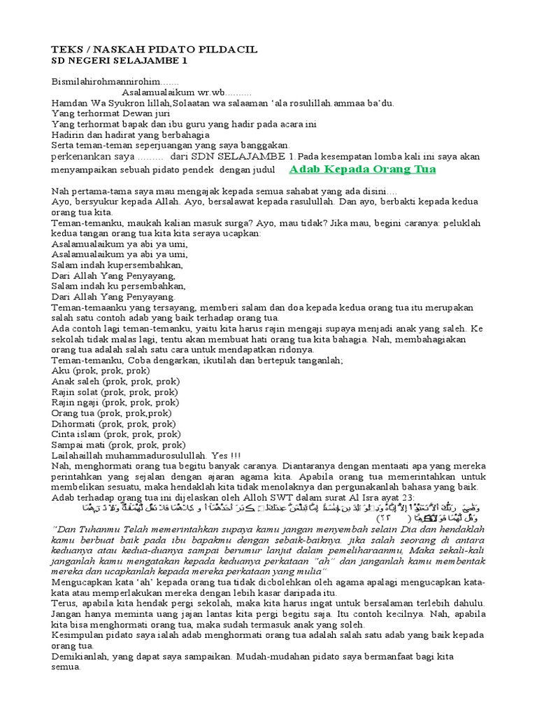 Di bulan suci ramadhan segenap umat muslimin menjalankan salah satu kewajibannya yakni menjalankan ibadah puasa dan menjauhi segala larangan atau hal hal yang dapat menyebabkan puasa menjadi batal atau tidak syah dalam hukum islam. Kesimpulan pidato saya ialah adab menghormati orang tua adalah salah satu adab yang baik kepada orang tua. Berikut informasi sepenuhnya tentang teks bacaan untuk anak sd kelas 1.