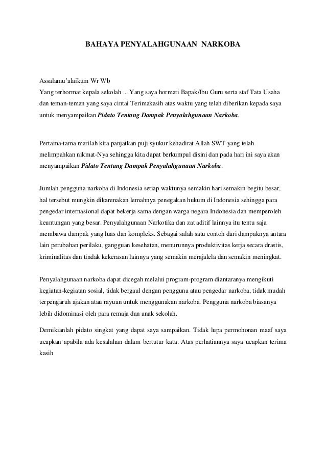 Pidato Bahasa Indonesia Pembasmian Narkotika Dan Obat Obat. Sesorah adalah merupakan bentuk dari pidato dengan menggunakan bahasa jawa pidato sendiri memiliki arti berbicara menggunakan lisan di hadapan banyak orang orang umum untuk tujuan tertentuAda berbagai jenis pidato bahasa jawa yang biasa digunakan berbagai. Sebagai generasi muda sangat penting bagi kita untuk mengetahui dampak ketika kita menggunakan narkoba.
