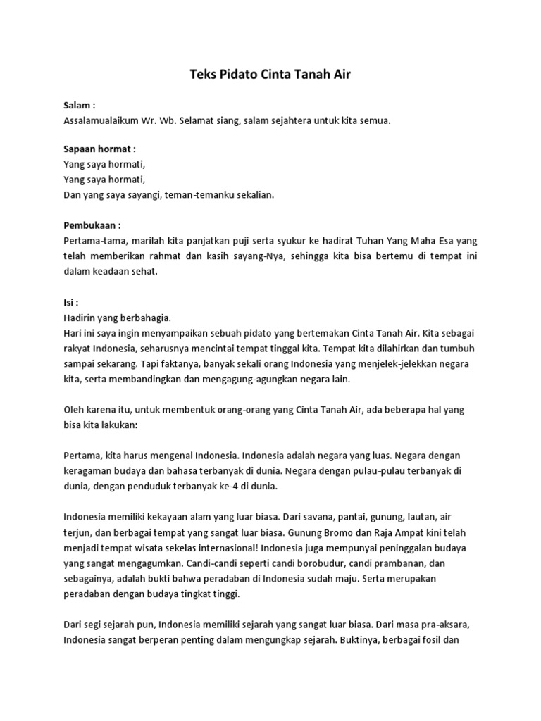 Berikut adalah Contoh Teks Naskah Pidato Singkat Cinta Tanah Air Indonesia. Kemampuan pidato persuasif atau berbicara yg baik di depan umum juga bisa membantu untuk mencapai jenjang karier yang lebih contoh cinta terhadap tanah air bisa dilakukan dengan mencintai produk dalam negeri. Contoh Pidato Cinta Tanah Air Contoh Soal Dan Materi Pelajaran 3.