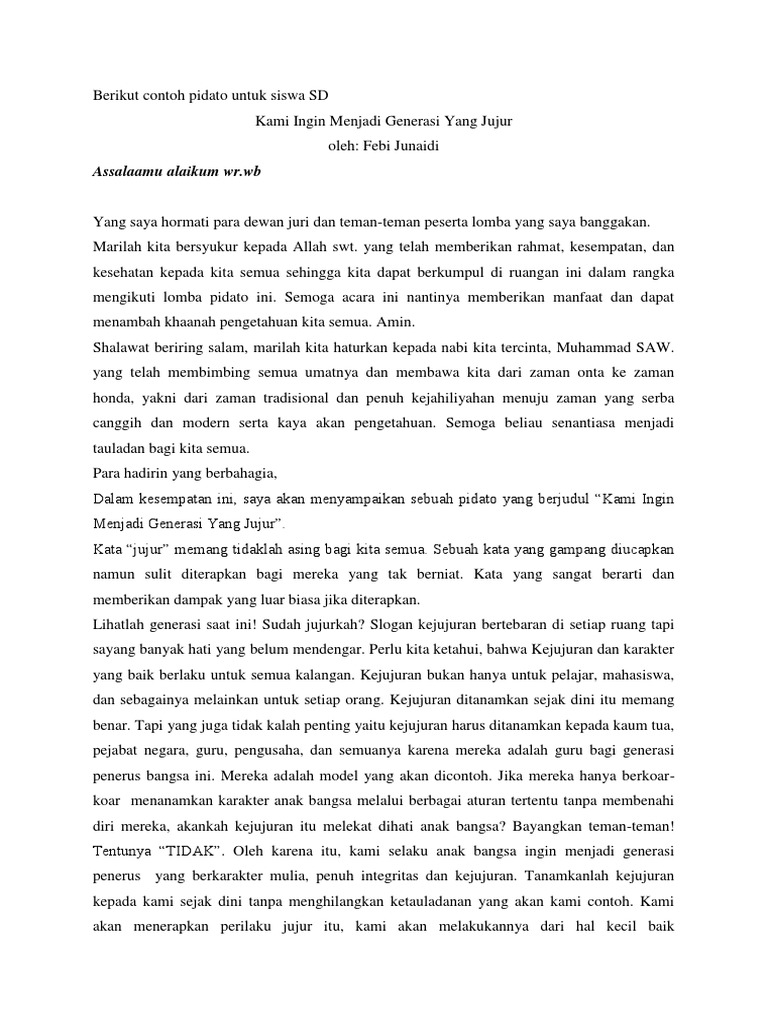 Contoh Pidato Singkat tentang Kejujuran. Pidato Bertema Kejujuran adalah contoh teksnaskah Pidato Umum menggunakan Bahasa Indonesia. Silahkan anda edit seperti.