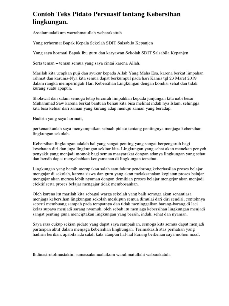 Saat ini kesadaran untuk menjaga kebersihan di kalangan kita sebagai seorang murid sangatlah kurang. Contoh Teks Pidato Persuasif tentang Sumpah Pemuda. Menjaga kebersihan lingkungan merupakan suatu perilaku kecil yang dapat bermanfaat dalam menyelamatkan bumi kita.